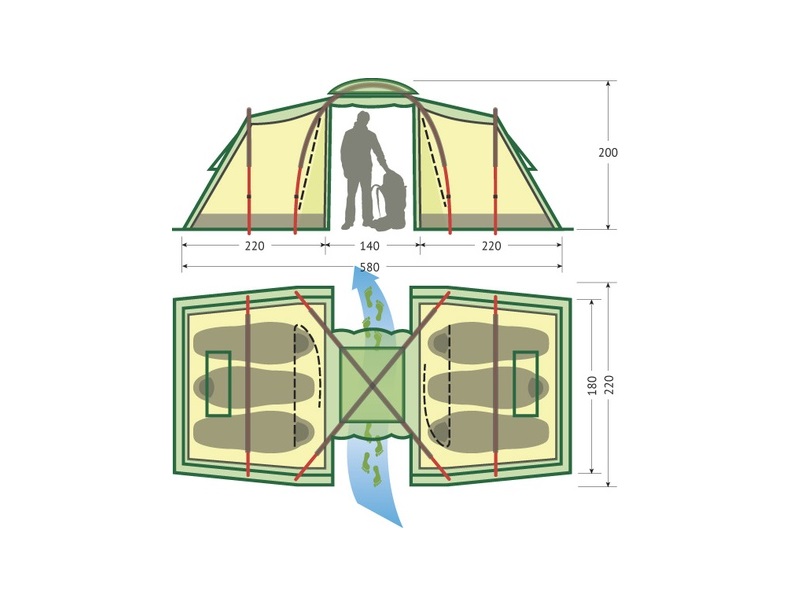 Комфорт сна обеспечивается двухслойной конструкцией палатки. Поток воздуха циркулирует в пространстве между внешним тентом и внутренней палаткой, испаряет конденсат, забирает продукты дыхания и выводит их через вентиляционную систему. Вентиляционная система состоит из вентиляционного отверстия в самой высокой точке купола. Отверстие защищено москитной сеткой и тканевым коробом. На торцах спальни размещены вентиляционные окна с тканевыми коробами. Для эффективной вентиляции обязательно откройте и натяните защитные короба над вентиляционным окном. Если ожидается очень сильный дождь, то следует закрыть вентиляцию полностью. В жаркую погоду козырьки можно отстегнуть по сторонам, свернуть и закрепить над окном. Еще одно вентиляционное окно совмещено с прозрачной вставкой на входе в палатку.