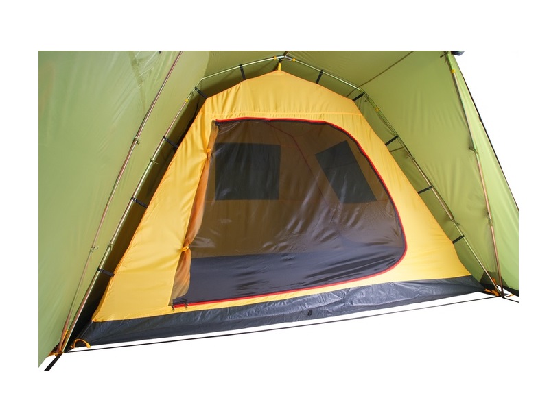 Вход во внутреннюю палатку закрывается как тканевым пологом, так и москитной сеткой для вентиляции в жаркую погоду. Чтобы в критический момент не перепутать молнии выхода и москитной сетки, они имеют различный цвет: красная молния открывает выход, а черная - москитную сетку. Молнии крупные, 8-го размера. На замках молнии удобные петельки оранжевого и черного цвета. Открытые пологи входа можно свернуть и зафиксировать баклей. При полностью закрытом входе внутренняя палатка надежно защищает от пауков, комаров, змей и даже муравьев. Старайтесь держать внутреннюю палатку всегда закрытой.