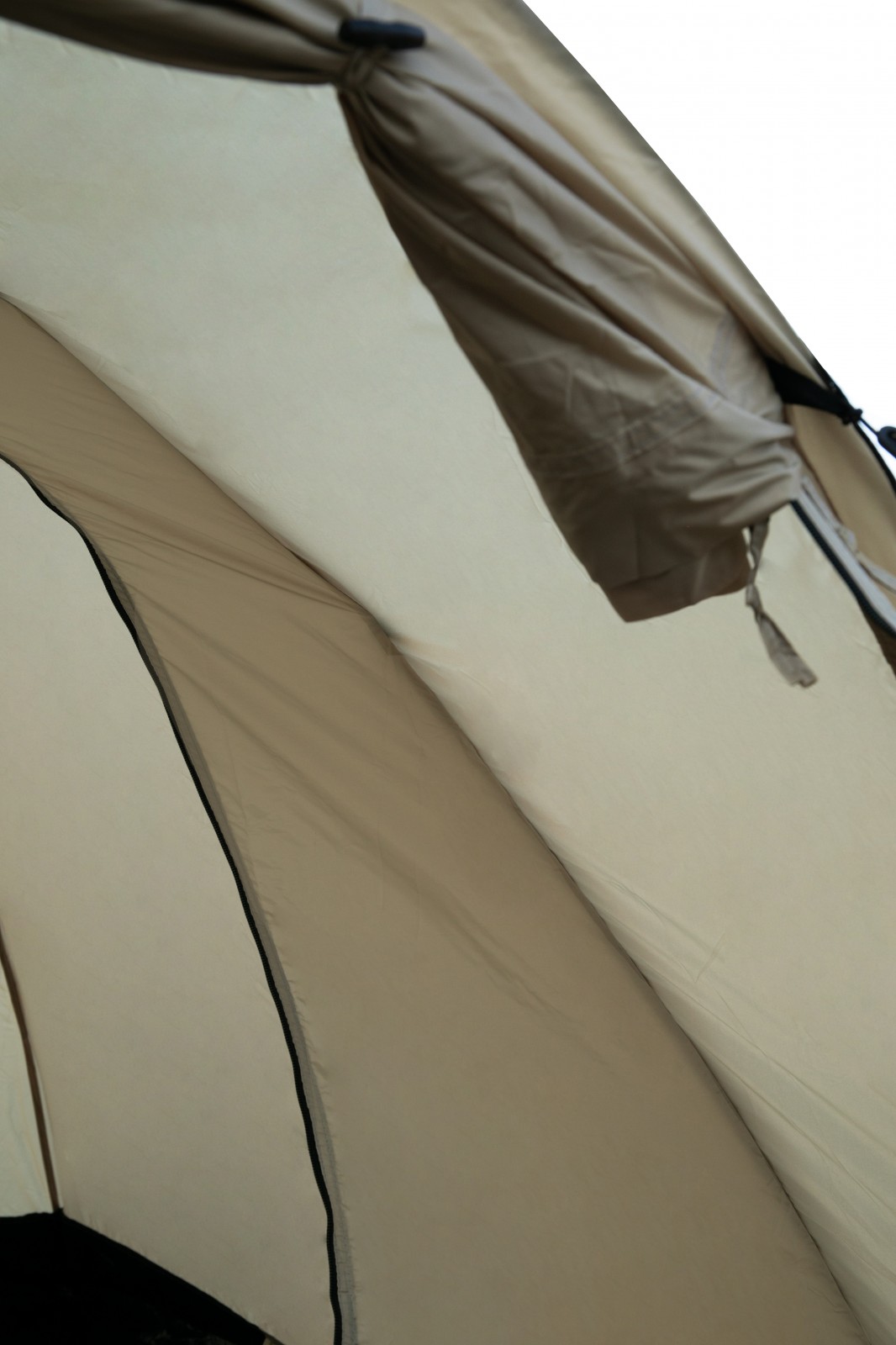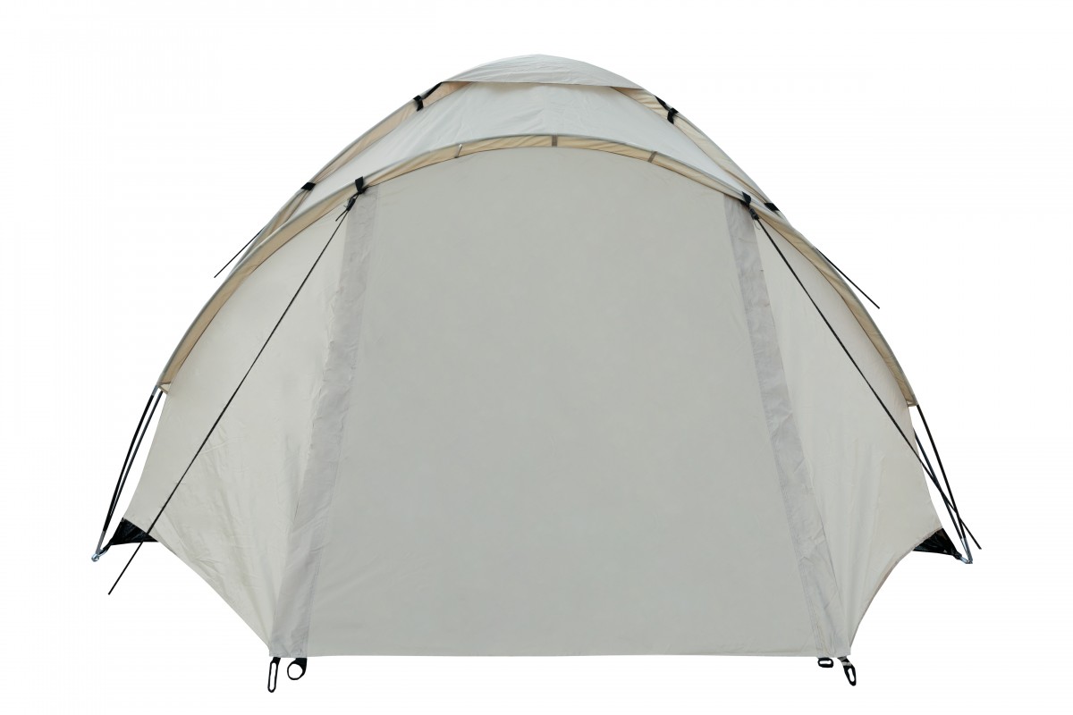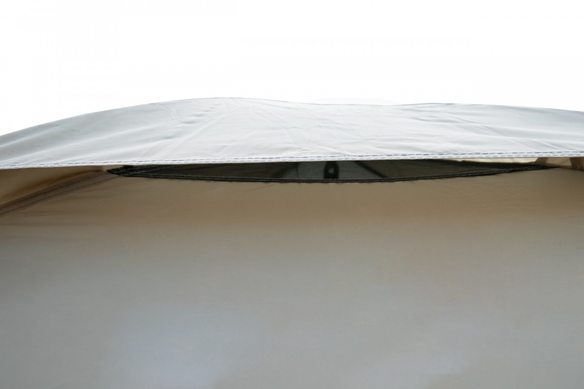 Однослойная палатка с вместительным тамбуром. Вход спального отделения продублирован москитной сеткой. Все швы проклеены. Вентиляционное окно в верхушке купола.